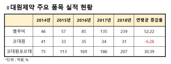 이같은 대원제약의 매출 정체는 대표품목 부재에서 기인한다. 대원제약의 대표격으로 뽑을 수 있는 품목은 펠루비와 코대원이 전부.