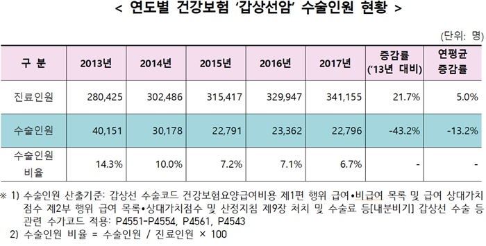 분석 자료에 따르면 갑상선암 수술인원은 2013년 4만 151명에서 2017년 2만 2796명으로 약 1만 7355명이 감소해 2013년 대비 43.2%가 하락했다.