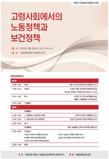 연세대학교 보건정책관리연구소는 오는 7월 3일 이명수 국회의원(자유한국당)과 함께 국회으원회관 제1세미나실에서 '고령사회에서의 노동정책과 보건정책 포럼'을 개최한다.