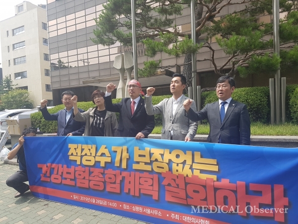 의협 집행부는 지난달 28일 오후 1시 30분 건강보험심사평가원 서울사무소 앞에서 집회를 열고, '적정수가 보장 없는 국민건강보험 종합계획 철회하라'는 성명을 발표했다. 의협은 정부의 수가정상화 의지가 없는 것으로 판단하고 수가정상화가 이뤄지지 않을 경우 파국적 결과를 맞을 것이라고 언급했다.