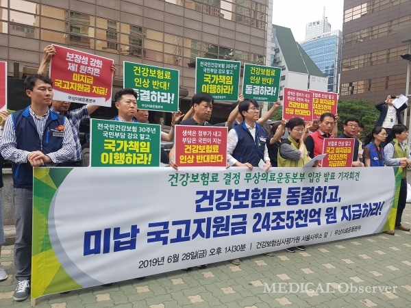 같은날 건정심 가입자단체도 시위를 통해 "가입자들의 국고지원 확대 요구 등 정부가 책임을 다하기 위한 적극적인 조치가 없다면 올해 보험료 인상을 동결해야 한만"며 "국민들에게 보험료만 강요하지 말고 법적으로 규정된 건보 국고지원 미납에 대한 명확한 납부 입장을 밝혀야 할 것"이라고 언급했다.