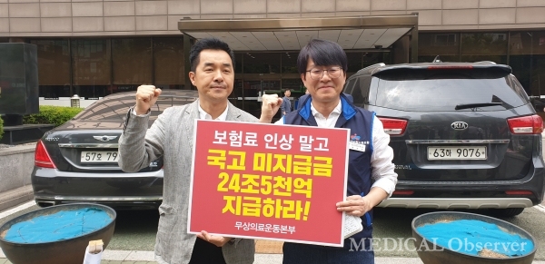 대한의사협회 방상혁 상근부회장이 황병래 국민건강보험 노조위원장과 함께 무상의료운동본부의 피켓을 들고 서있는 모습. 방상혁 부회장은 국고지원금 지급 취지에 공감해서 사진을 찍었다고 언급한 것으로 전해졌다.