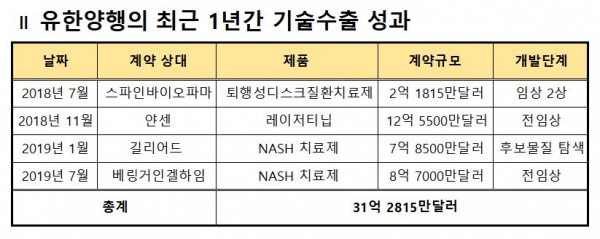이로써 유한양행이 최근 1년간 계약한 기술수출 규모는 31억 2815만달러로, 약 3조 6000억원에 이른다.