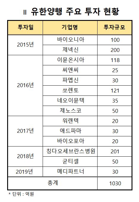 실제 유한양행은 2015년 제넥신에 200억원을, 바이오니아에 100억원을 투자한 것을 시작으로, 2016년 제노시스에 50억원을 투입했다.