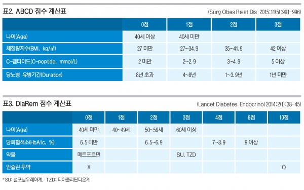 ABCD 점수는 대만 연구팀이(Surg Obes Relat Dis 2015;11(5):991~996), DiaRem 점수는 미국 연구팀이(Lancet Diabetes Endocrinol 2014;2(1):38~45) 개발해 각각 아시아인과 서양인에게 주로 활용된다.