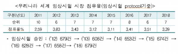 식약처는 "우리나라는 양질의 풍부한 의료 인력과 미국, 유럽의 4분의 1 수준의 저렴한 임상시험 비용으로 임상시험 유치에 유리한 여건이었으나, 수입통관 비용 증가, 인건비 상승 등으로 경쟁력이 줄어들었다"고 분석했다.