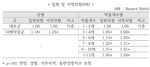 특히, 다제약물군 중에서도 처방약물 개수가 증가할수록 입원, 사망 위험이 높아져 11개 이상 복용군은 2개 이하 복용군보다 입원 및 사망위험이 각각 45%, 54%까지 증가했다.