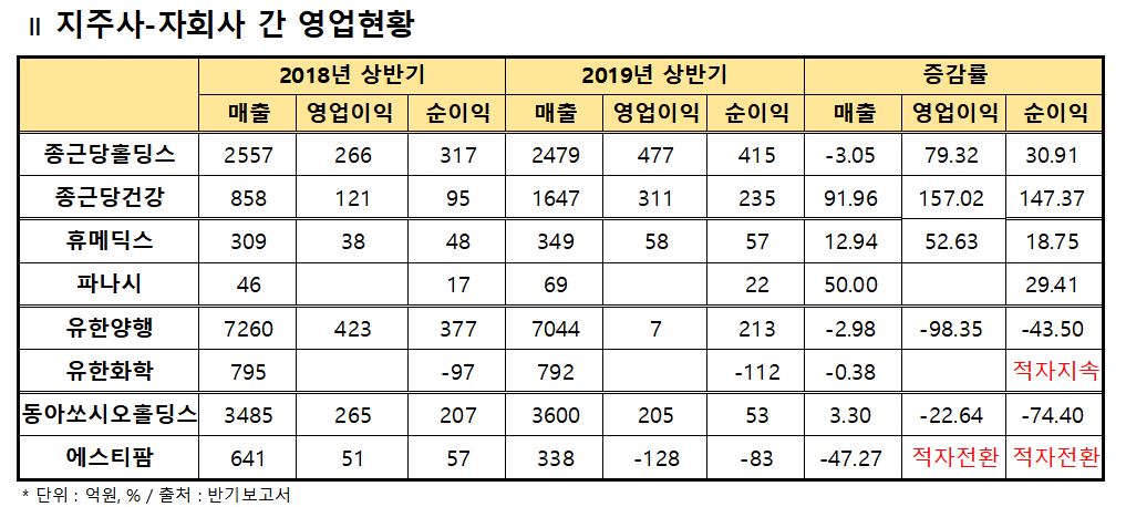 종근당건강과 파나시는 실적이 큰 폭 개선되면서 종근당홀딩스와 휴메딕스에 효자 노릇을 했고, 유한화학과 에스티팜은 부진을 겪으면서 각각 유한양행과 동아쏘시오홀딩스의 실적 하락에 영향을 미쳤다.