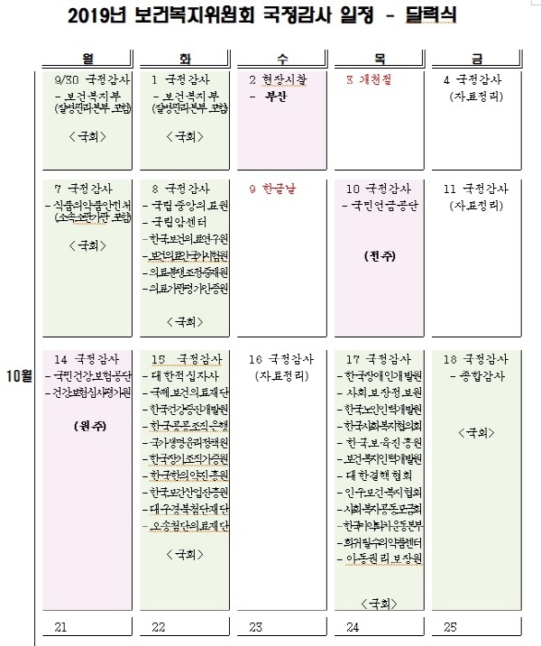 10월 17일 한국희귀필수의약품센터와 한국마약퇴치운동본부 등에 대해 감사하며, 10월 18일 종합감사로 2019년도 국정감사는 마무리된다.