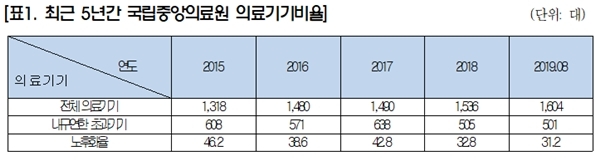 실제로 NMC가 보유한 의료기기 중 501대가 내구연한을 초과해 운영되고 있는 것으로 집계됐으며, 이는 현재 NMC가 보유한 의료기기 총 1604대 중 31.2%에 달하는 수치다.