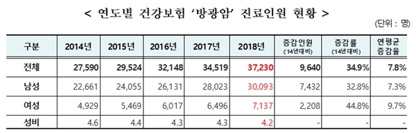 최근 5년동안 건강보험 가입자 중 방광암으로 요양기관을 방문한 진료인원은 2014년 2만 7000여명에서 2018년 3만 7230명으로 34.9%(연평균 7.8%) 증가했다.