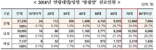 성별로 따로 분류하면 남성의 경우 70대 1만 550명(35.1%), 60대 8208명(27.3%), 80대 이상 6068명(20.2%) 순이며 여성의 경우에도 남성과 같이 70대, 60대, 80대 이상 순으로 나타났다.