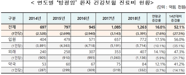 방광암 환자 건강보험 진료비는 2014년 697억원에서 2018년 1263억원으로 566억원이 늘었는데 이는 연평균 16% 증가한 수치다.