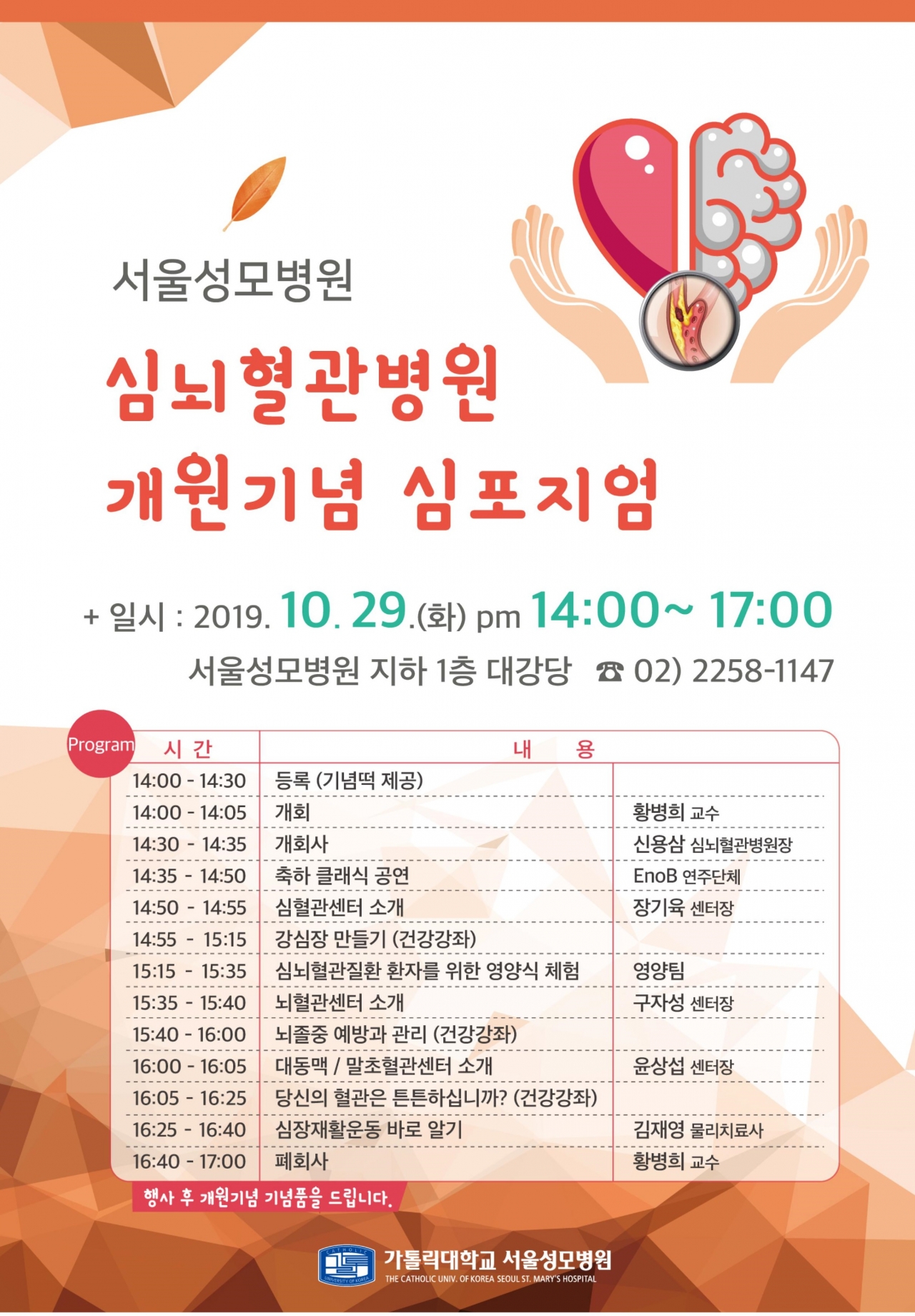 심포지엄에서는 심뇌혈관병원의 중점 센터인 심혈관센터(장기육 센터장), 뇌혈관센터(구자성 센터장), 대동맥/말초혈관센터(윤상섭 센터장) 소개와 더불어, 질환별 각 분야에 대한 내외과적 치료 및 중재시술의 최신 지견과 앞으로 발전 방향에 대해 공개강좌와 영양식 체험, 심장재활운동 강의, 축하 클래식 공연 등 다양한 프로그램이 준비돼 있다.