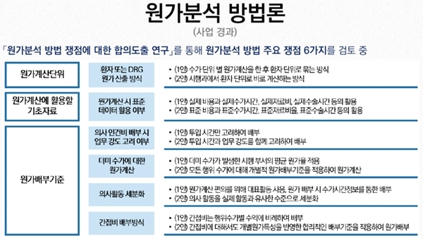 특히, 원가분석 방법 주요 쟁점 6가지를 검토하기 위해 지난 7월 시작된 '원가분석방법 쟁점에 대한 합의도출 연구 용역'이 연세대학교 이해종 교수(보건행정학과)를 책임자로 오는 12월 21일까지 진행된다.