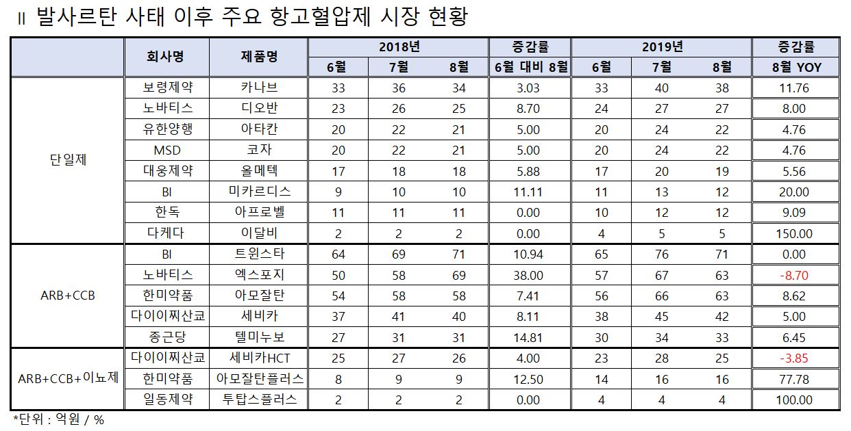 두 제품 모두 작년 발사르탄 사태가 터졌을 당시 기록했던 증가율 각각 5%, 5.88%에 비해 줄어든 것이다.