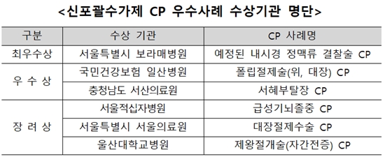 이어 국민건강보험 일산병원은 폴립절제술 CP로, 충청남도 서산의료원은 서혜부탈장 CP로 우수상을 받았고 서울적십자병원(급성기뇌졸중 CP), 서울시 서울의료원(대장절제수술 CP), 울산대학교병원(제왕절개술 CP)은 장려상에 올랐다.