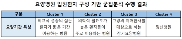 요양병원 입원환자 구성을 기반으로 군집분석 하면 크게 4가지로 요양병원 유형이 분류된다는 이유에서다.