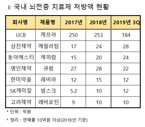 시장조사기관 유비스트에 따르면 UCB 케프라(성분명 레비티라세탐)는 2017년 250억원, 2018년 253억원의 처방액을 올린 데 이어 올해 3분기까지 184억원의 처방실적을 보였다.