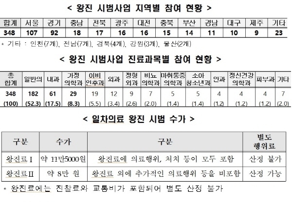 일차의료 왕진 수가 시범사업에 총 348개 의원이 참여 신청을 했으며, 지역별로는 서울 107곳, 경기 92곳 등이 가장 많았고, 진료과목별로는 일반의(52.3%)와 내과(17.5%), 가정의학과(8.3%), 이비인후과(5.5%), 외과(3.4%)의 비중이 높았다.