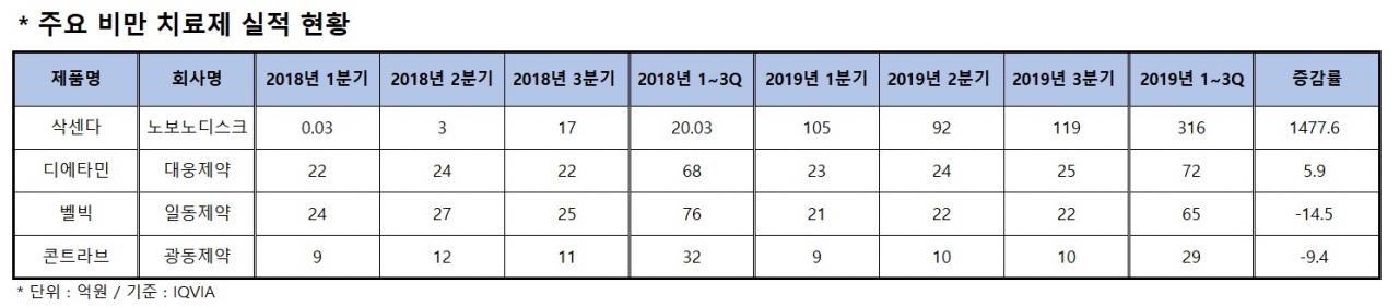 삭센다(성분명 리라글루타이드)의 지난해 1~3분기 매출은 전년 동기 대비 1477.6%, 디에타민(성분명 펜터민)은 5.9% 증가한 것과 대조적이다. 콘트라브(성분명 부프로피온/날트렉손)의 지난해 1~3분기 매출은 전년 동기 9.4% 감소했지만 벨빅보다는 감소 폭이 작다.