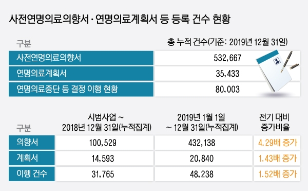 2019년 12월 31일 기준으로 사전연명의료의향서 누적 작성건수는 53만 2667건, 연명의료계획서는 3만 5433건이다.