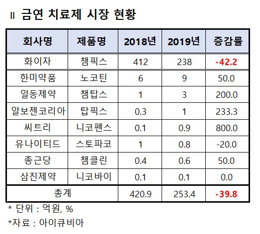 제품별로 살펴보면 금연 치료제의 대표격인 화이자의 챔픽스는 2018년 412억원에서 2019년 238억원으로 42.2% 급감했다. 지난해 실적이 전년에 비해 거의 반토막 난 것이다.
