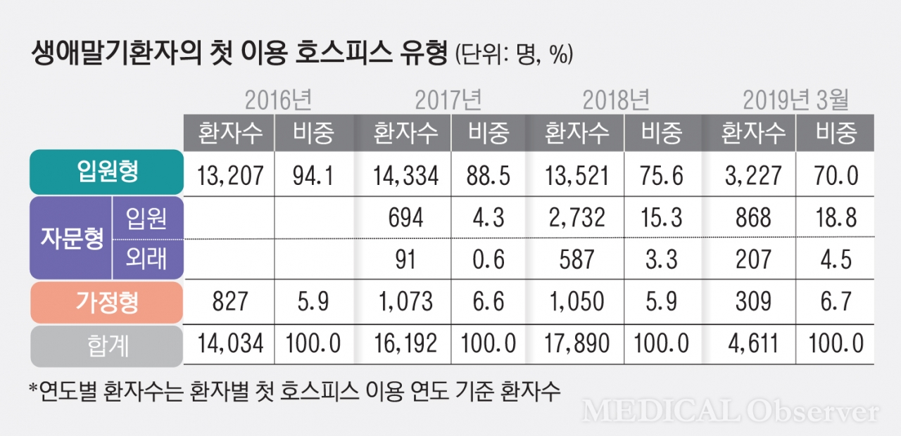 보다 구체적으로 호스피스 유형을 입원과 외래 기반으로 분리할 경우, 입원형과 입원자문형의 비중 합계가 2016년 94.1%, 2017년 92.8%, 2018년 90.9%, 2019년 3월 88.8%로 나타나 입원하에서의 서비스 접근이 더 좋은 것으로 확인됐다.