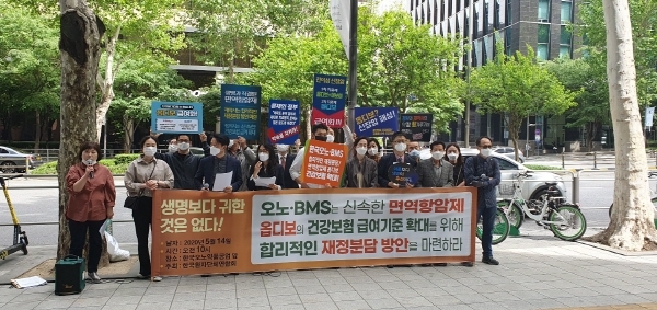 환자단체연합회는 기자회견을 통해 생명과 직결된 면역항암제 옵디보와 키트루다의 건강보험 급여기준 확대를 위해 한국오노·BMS와 한국MSD는 합리적인 재정분담 방안을 마련하고, 정부는 신속한 건강보험 급여화를 추진할 것을 요구했다.