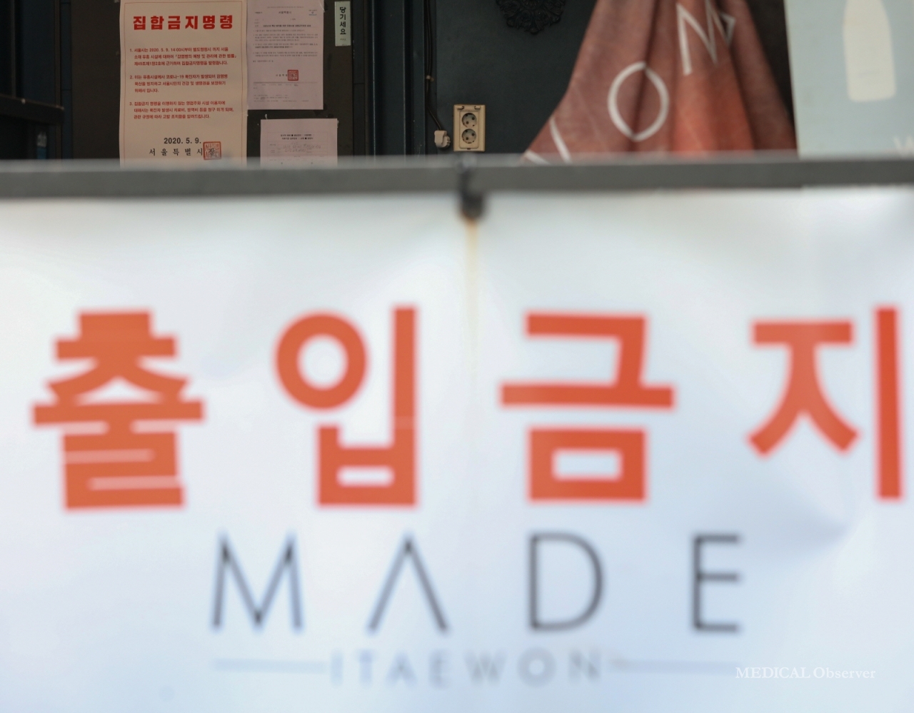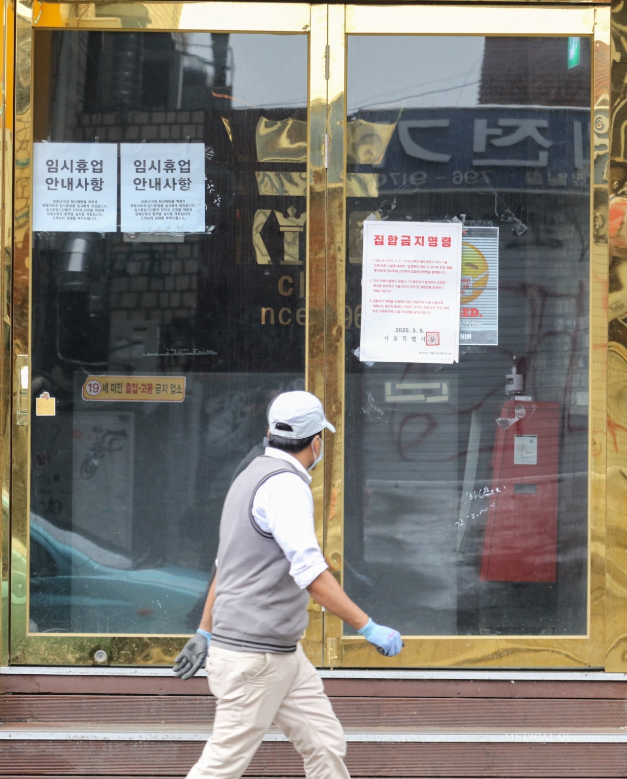 코로나19 확진자가 발생한 이태원 클럽 앞에 집합금지명령 문구가 붙어 있다.