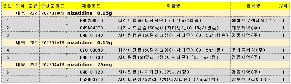급여중지가 해제된 7품은 △에이프로젠제약 니잔트캡슐 △대우제약 니지시드캡슐150mg △경동제약 자니틴캡슐150mg △우리들제약 위지티딘정150mg △경동제약 자니틴정75mg △경동제약 자니틴정150mg △알보젠코리아 자니티딘정75mg이다.