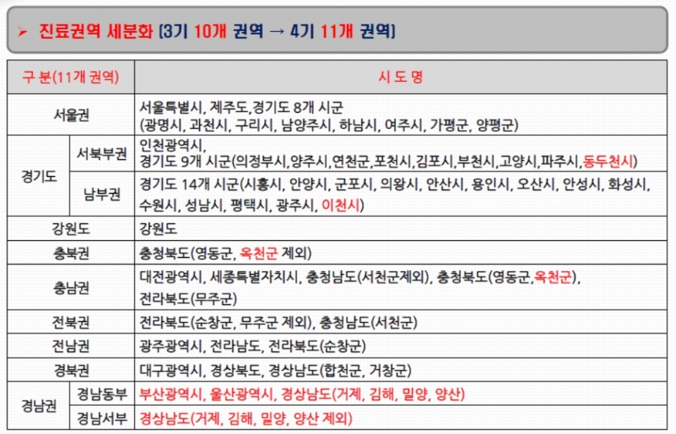 우선, 10개 권역인 제3기 상종 지정 때와 비교해 제4기에서는 경남권이 동부와 서부로 나뉘어 총 11개 진료 권역으로 바뀌었다.