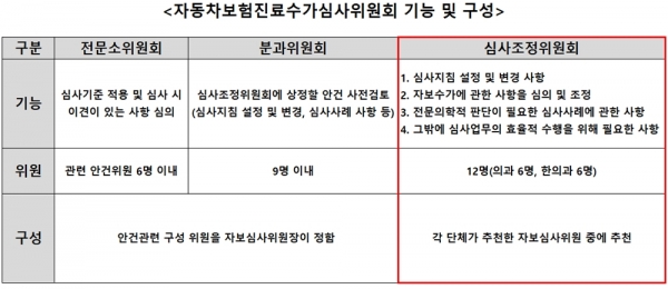 심평원 관계자는 "의결기구인 자보심사조정위원회는 이번에 처음 생긴 것으로 기존에는 전문가 자문단 운영을 통해서 해결했다"며 "이는 과실비율 분쟁심의위원회와는 다르다"고 설명했다.