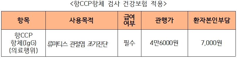 우선, 류마티스 관절염 조기진단에 유용한 항 CCP항체 검사가 필수급여로 건강보험이 적용된다.
