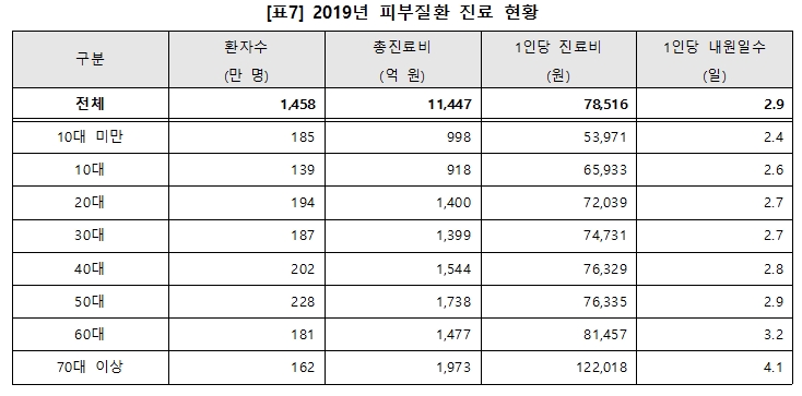 피부질환으로 진료 받은 환자수는 2009년 10명당 2.6명에서 2019년 10명당 2.8명으로 증가했고 2019년 피부질환 환자수는 50대 228만명, 40대 202만명, 20대 194만명 순으로 많다.