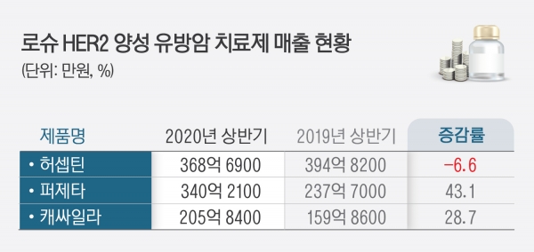 한편, 로슈는 올해 상반기 허셉틴과 퍼제타, 캐싸일라를 통해 914억 7400만원의 매출을 올려 1000억원 매출을 눈 앞에 두고 있다.