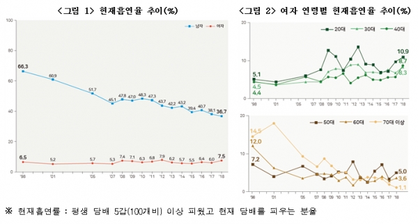 반면 여성 흡연율은 1998년 6.5%에서 2018년 7.5%로 소폭 증가했으며, 20~40대 여성의 흡연율은 20년간 약 2배 증가했다.