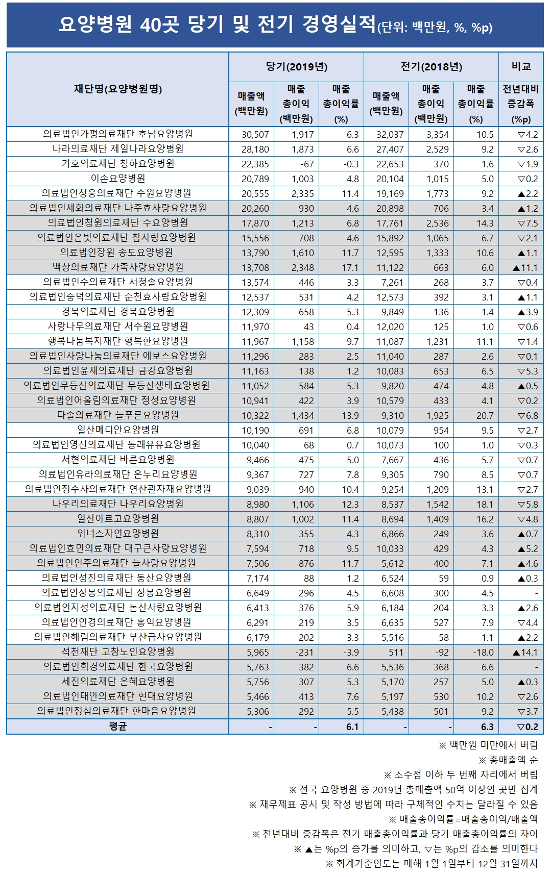 요양병원 40곳의 2019년 평균 매출총이익률은 6.1%로, 2018년 6.3%에 비해 0.2%p 하락했다.