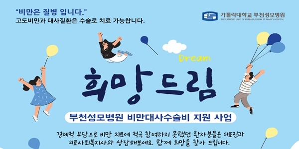 2020 부천성모병원 자선특화 사업인 '희망드림'은 경제적 어려움으로 치료에 적극적이지 못했던 고도비만 환자들의 사람의 질 향상과 비만으로 발생한 당뇨병, 고혈압 등 동반 질환 개선을 위해 사전 검사비, 입원비, 수술비를 지원하는 사업이다.