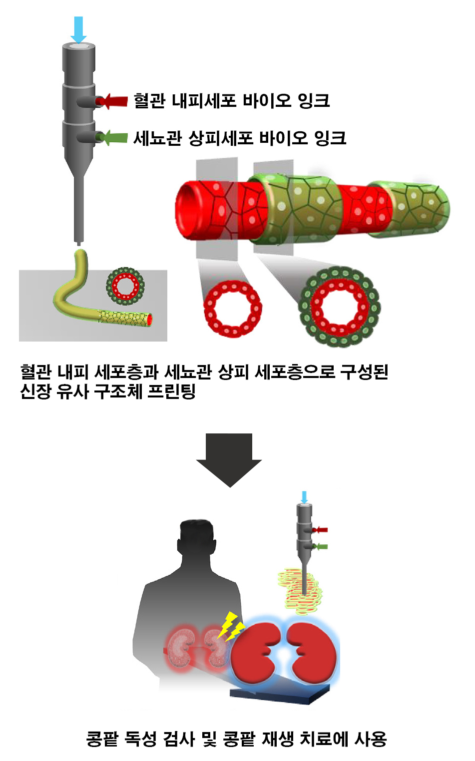포항공대 조동우 교수와 가톨릭대 성빈센트병원 김용균 교수(신장내과, 가톨릭대 세포사멸질환 연구센터) 연구팀이 개발한 3D 신장 세뇨관-혈관 관상 구조체는 실제 인간의 신장처럼 미세 혈류가 흐를 수 있다. 이와 함께 신장의 필수 기능인 근위 세뇨관과 혈관 사이의 재흡수 및 분비 기능을 정밀하게 구현했다.