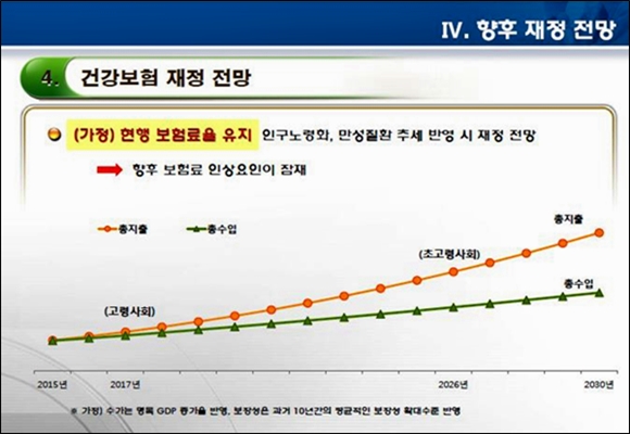 당장은 건보료 총 수입이 더 높지만, 현행 건보료를 유지했을 때 고령사회인 2017년에는 건강보험 재정의 총수입과 총지출이 비슷해지며 흑자분이 0에 가까워질 것이라고 예측했다.