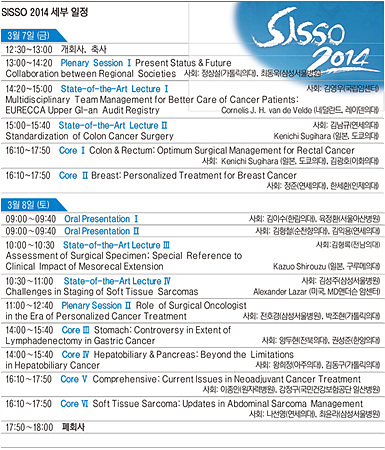 학회 연제의 꽃이라고 할 수 있는 State-of-the-Art Lecture에서는 네덜란드 레이덴의대 Cornelis J.H. van de Velde 교수가 암 치료에 있어서 다학제적 관리의 중요성을 소개할 예정이다. 또 도쿄의대 Kenichi Sugihara 교수도 결장암 수술의 표준적 치료에 대한 강연을 진행할 것으로 예정돼 있어 많은 관련 전문가들의 관심이 몰릴 것으로 전망된다.