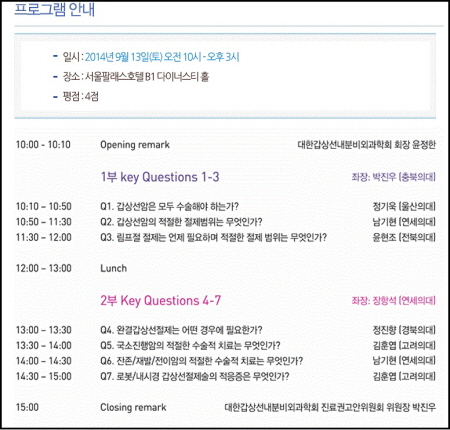 심포지엄에서는 △갑상선암은 모두 수술해야 하는가 △갑상선암의 적저한 절제 범위는 무엇인가 △림프절 절제는 언제 필요하며 적절한 절제 범위는 무엇인가 △완결갑상선절제는 어떤 경우에 필요한가? △국소진행암의 적절한 수술적 치료는 무엇인가 △잔존/재발/전이암의 적절한 수술적 치료는 무엇인가 △로봇/내시경 갑상선절제술의 적응증은 무엇인가에 대한 7개의 핵심질문(key question)을 주제로 1, 2부에 걸쳐 상세한 논의가 진행될 예정이다.