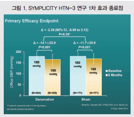 비교결과 1차 안전성 종료점은 신장신경차단술군 1.4%, 대조군 0.6%로 차이를 보였다. 하지만 연구팀은 시술로 인한 주요 유해사건 발생률 기준선이 9.8%라는 점을 들며 안전성에서는 큰 차이가 없었다고 말했다. 하지만 기대를 모았던 효과 종료점에서는 유의한 차이가 없었다. 신장신경차단술군의 진료실 측정 수축기혈압은 166mmHg, 대조군은 168mmHg로 각각 14.1mmHg, 11.7mmHg 감소한 것으로 나타났고, 2차 종료점이었던 24시간 활동 수축기혈압은 각각 152mmHg, 154mmHg로 6.9mmHg, 4.8mmHg 감소했다.