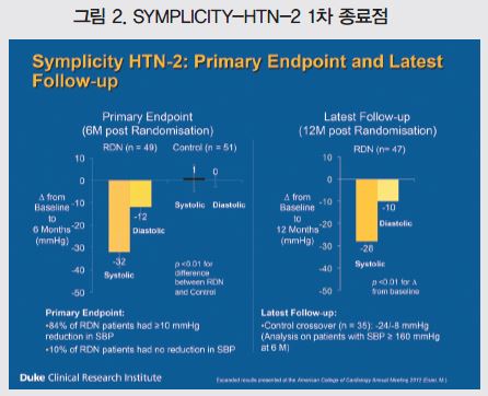 1차 효과 종료점은 6개월째 진료실 혈압측정을 통한 수축기혈압의 변화로, 평가결과 신장신경차단술군(52명)은 32mmHg, 대조군(54명)은 1mmHg 감소한 것으로 나타났다.