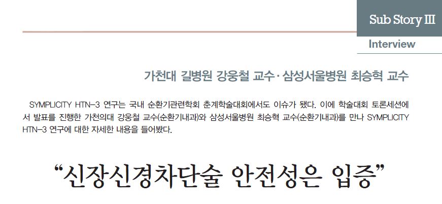 SYMPLICITY HTN-3 연구는 국내 순환기관련학회 춘계학술대회에서도 이슈가 됐다. 이에 학술대회 토론세션에서 발표를 진행한 가천의대 강웅철 교수(순환기내과)와 삼성서울병원 최승혁 교수(순환기내과)를 만나 SYMPLICITY HTN-3 연구에 대한 자세한 내용을 들어봤다.