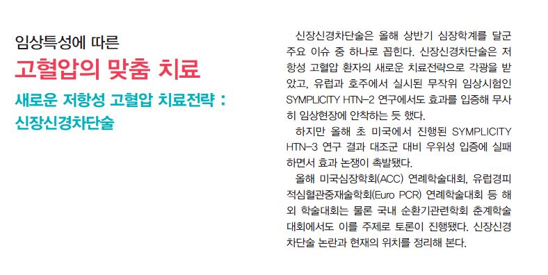 - SYMPLICITY HTN-3 연구가 실패하면서 신장신경차단술 유용성 논란이 많다. 어떻게 정리할 수 있나?