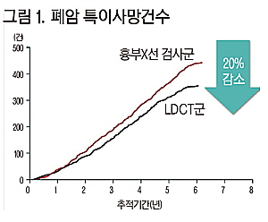 여기에는 미국에서 30갑년 이상의 흡연력을 가진 55~74세 연령군(2만 6722명)에게 1년 간격으로 총 3회 LDCT를 시행했을 때 흉부 X선으로 검사한 대조군(2만6732명)에 비해 폐암 특이사망률을 20%, 전체사망률을 6.7% 감소시켰다는 NLST 연구(National Lung Screening Trial) 결과가 결정적인 영향을 미쳤다(NEJM. 2011;365:395-409) <그림 1>.