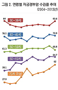 국립암센터가 제공한 대국민 암검진 수검행태조사 결과에 따르면 2012년 기준 30대 여성들 가운데 조기검진 목적으로 자궁경부암세포검사를 시행받은 비율은 55.4%로, 70세 이상(54.1%)을 제외한다면 50대(77.6%), 40대(75.1%), 60대(65.2%) 다음으로 검진율이 가장 낮았다. 2004년부터 2012년까지의 수검률 추이 분석에서도 40대(4.6%p), 50대(16.3%p), 60대(27.1%p), 70세 이상 그룹(26.2%p)에서 모두 검진율 증가를 보인 데 반해 30대에서는 8.6%p(64%→55.4%) 감소했다 <그림 2>.