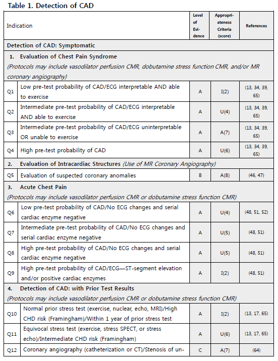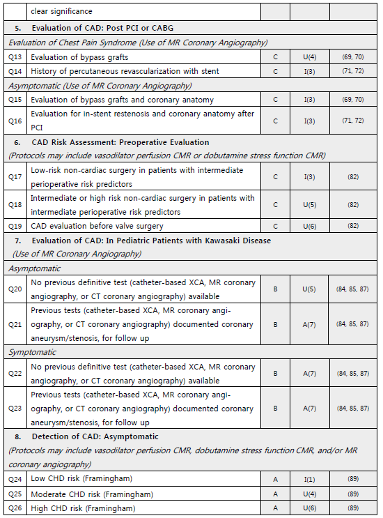 아울러 같은 상황에서 흉통 무증상 환자군에 사용하는 것도 권고되지 않는다(I). 심장 수술전 CAD 위험 평가를 위해 CMR을 사용하는 것도 전반적으로는 확실하지 않다는 가이드라인을 제시했다.